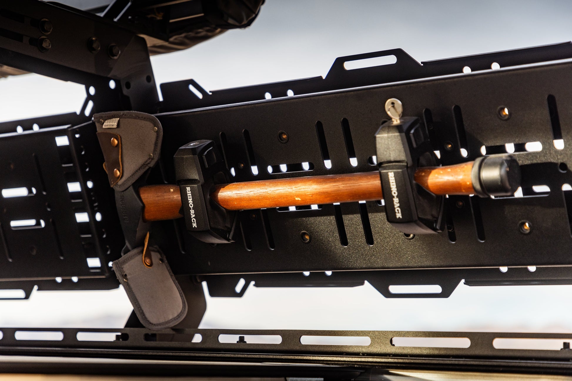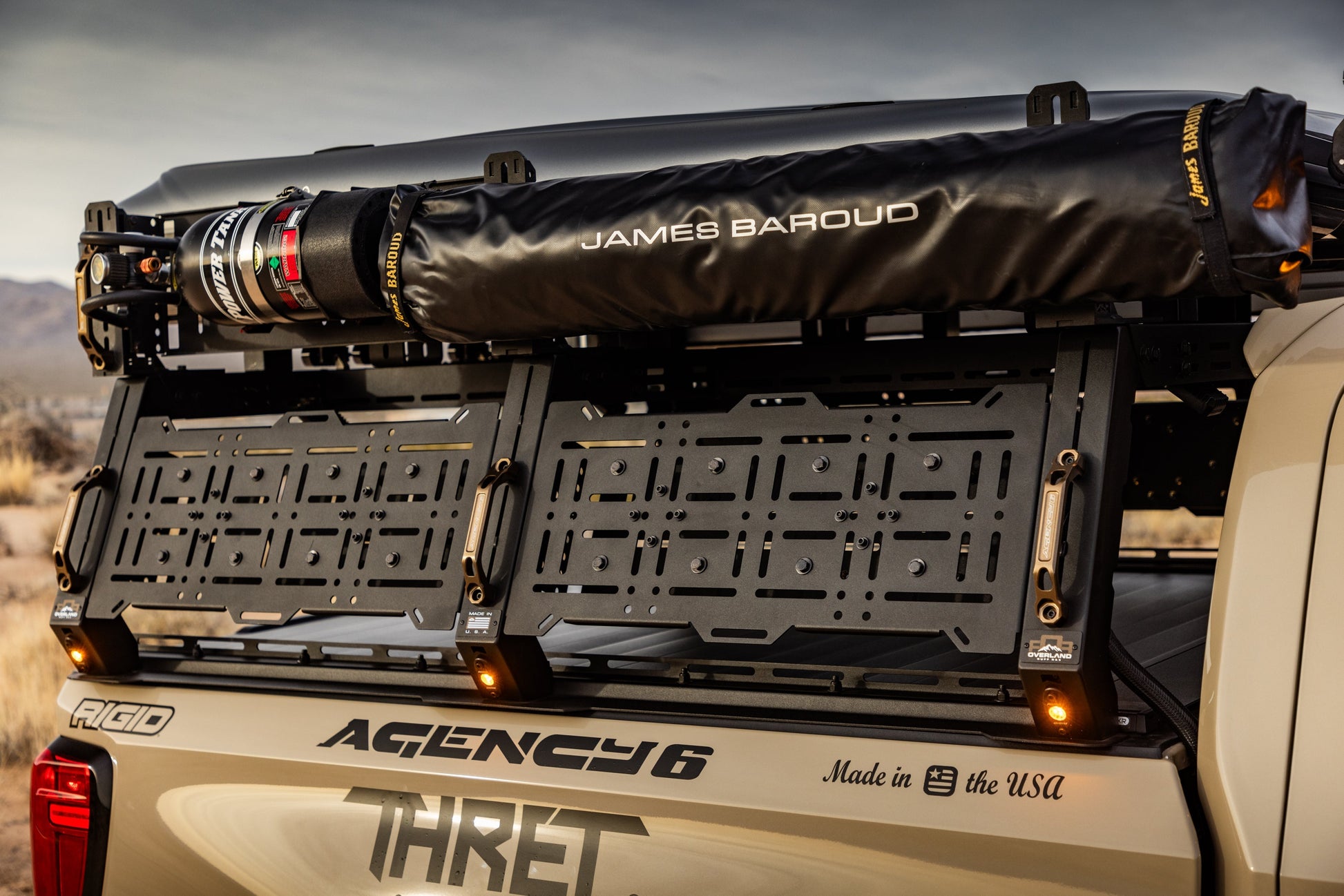 Bed Rack Components: Base Plates (2) Side Uprights (6) Cross Members (3) Center Spines (2) Other options include center spines supports for smaller RTT's. Also Includes four (4) Hybrid Molle Panels and Hardware kit for rack and molle panels.