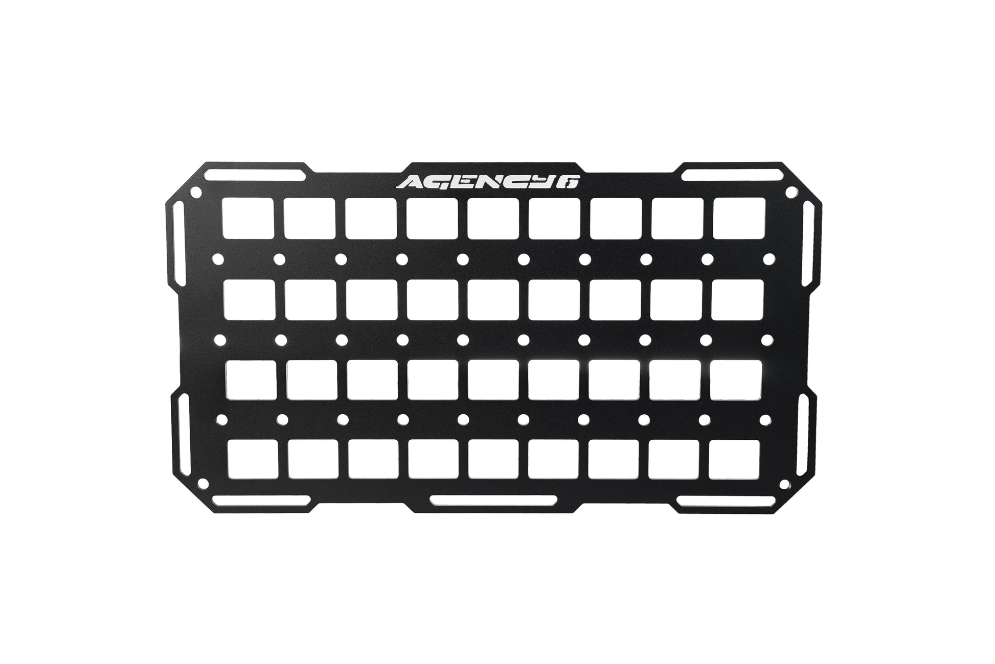 Tired of everything rolling around back there? Want to keep important equipment at the ready? Add organization to your vehicle with the Agency 6 GRIDS panel. This storage solution gives you vertical real estate for mounting a variety of accessories. MOLLE pattern cutouts allow for a range of camping and off-road components to be securely strapped directly to the panels. Slots on the perimeter are ideal for mounting lights, or as additional strap points. Panel includes stainless steel mounting hardware and machined aluminum stand-offs.