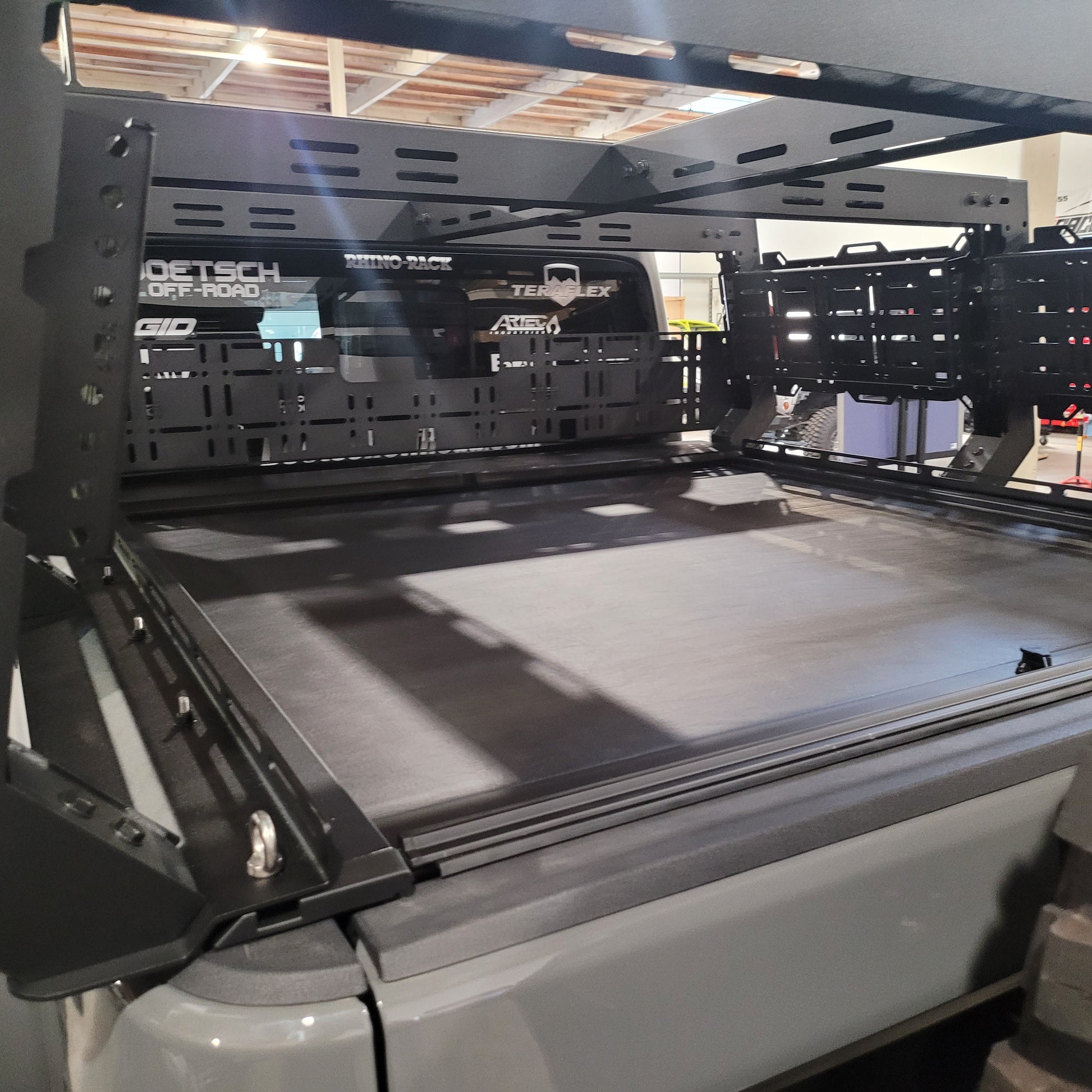 Bed Rack Components: Base Plates (2) Side Uprights (6) Cross Members (3) Center Spines (2) Other options include center spines supports for smaller RTT's. Also Includes four (4) Hybrid Molle Panels and Hardware kit for rack and Molle panels.