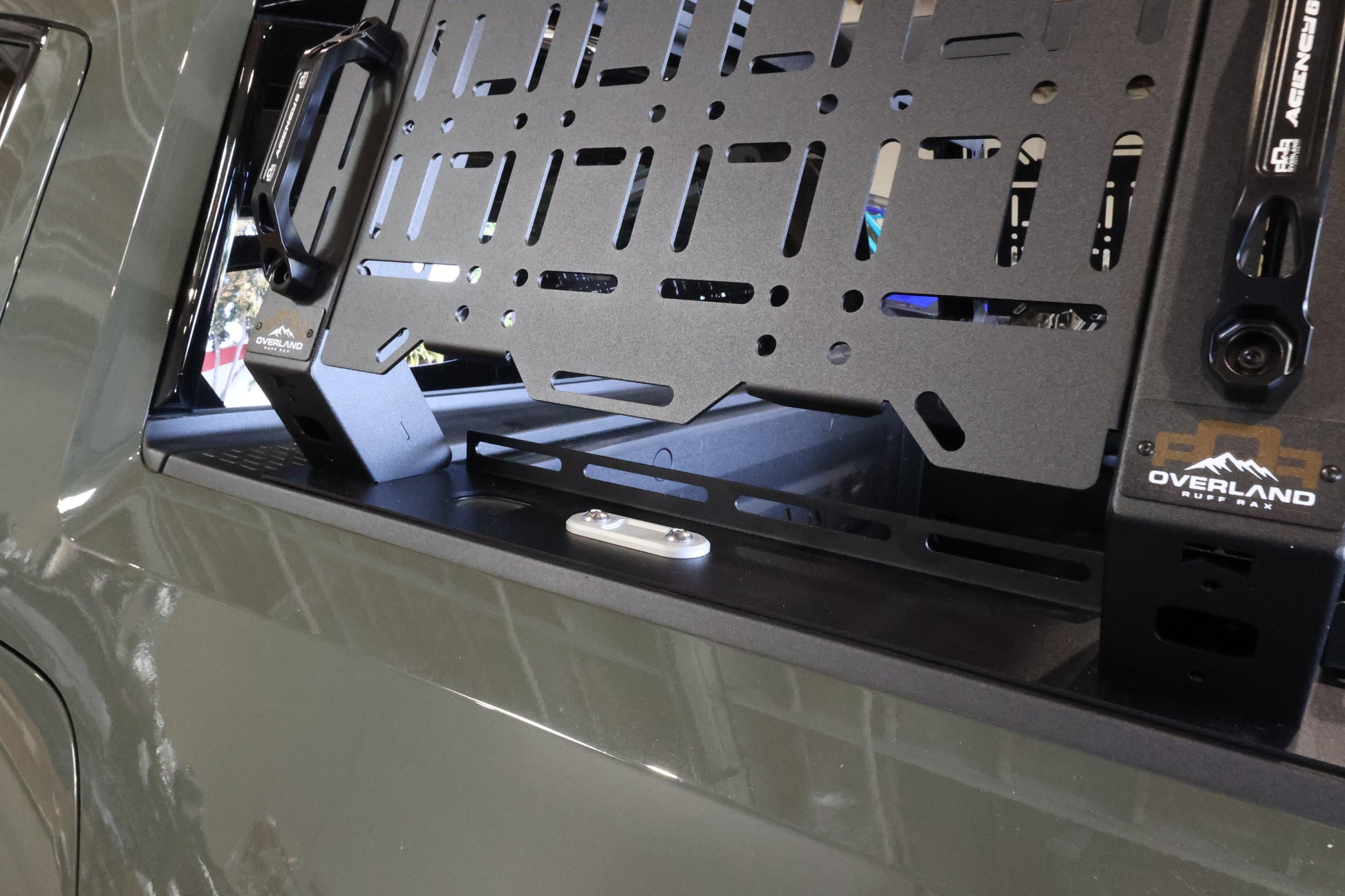 Bed Rack Components: Base Plates (2) Side Uprights (6) Cross Members (3) Center Spines (2) Other options include center spines supports for smaller RTT's. Also Includes four (4) Hybrid Molle Panels and Hardware kit for rack and molle panels.